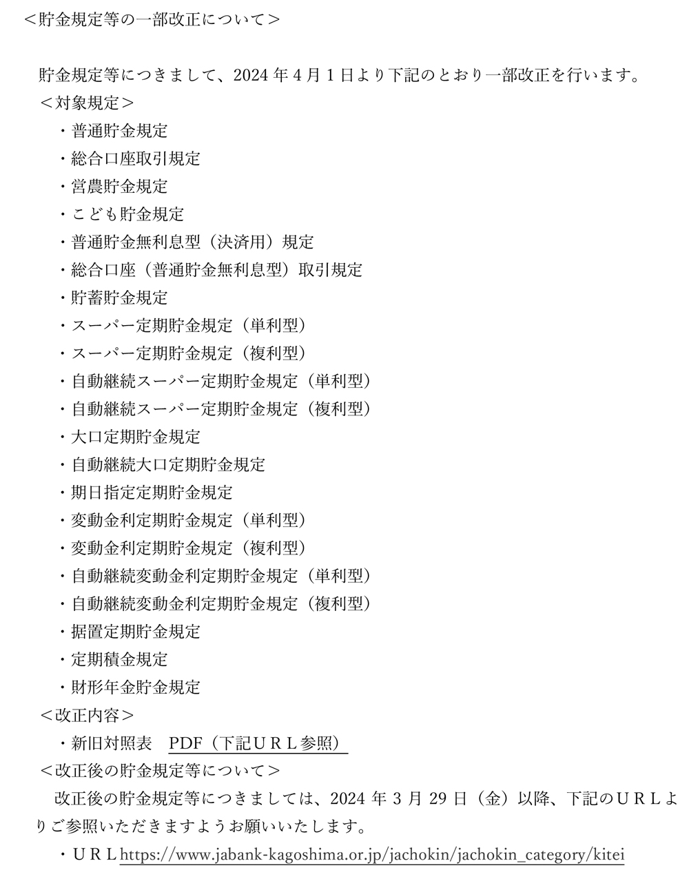 貯金規程等の一部改正 PDFはこちら↓ 「貯金規定等の一部改正について」 改定後の料金規定についてはこちら↓ https://www.jabank-kagoshima.or.jp/jachokin/jachokin_category/kitei