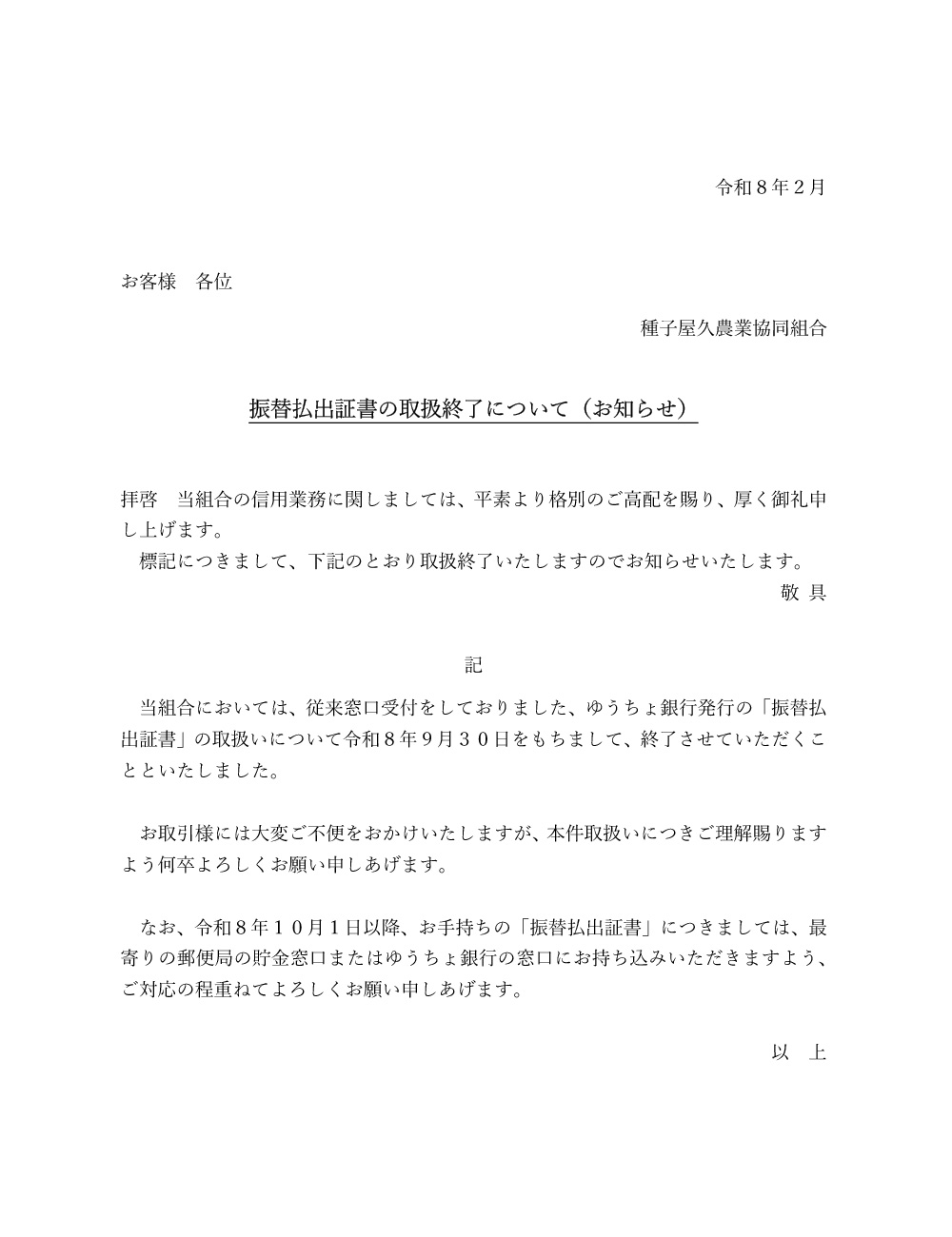 振替払出証書の取扱終了について